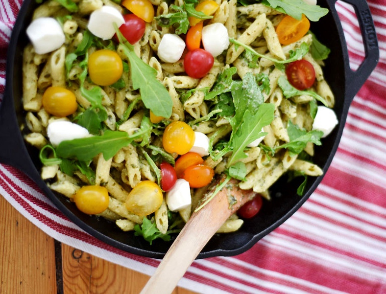 ИНГРЕДИЕНТЫ: 450 г пасты, 4 зубчика чеснока, 450г томатов черри, 3-4 стакана рукколы, 100 г песто, 250 г свежей моцареллы, оливковое масло, соль, перец.