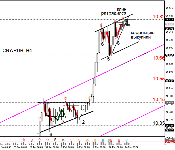Всем привет! Вчерашняя стремительная коррекция, которая произошла уже во второй половине торгов, безусловно, была обусловлена валютными интервенциями. Восходящий клин, который до этого формировался на графике, «требовал» разрядки в виде коррекции, и она произошла. Но дело в том, что прошедшую коррекцию практически сразу всю выкупили быки. Другими словами: КЛИН – РАЗРЯДИЛСЯ, А КОРРЕКЦИЮ ВЫКУПИЛИ. Все это, на мой взгляд, говорит о силе бычьих настроений на юане. Поэтому коррекция, которую мы видели, и которая отработала параллельную линию канала, на этом может и завершиться. Так что, если цена продолжит расти, и в итоге сможет преодолеть локальный максимум 10,823, я буду добавлять длинные позиции. Но есть одна особенность, о которой необходимо сказать отдельно. С точки зрения Альтернативного волнового анализа, цена сейчас удерживается внутри диапазона (клина, перешедшего в канал, после коррекции), который по-прежнему обусловлен КАМНЕМ. Другими словами, все, что мы видим на графике: вал