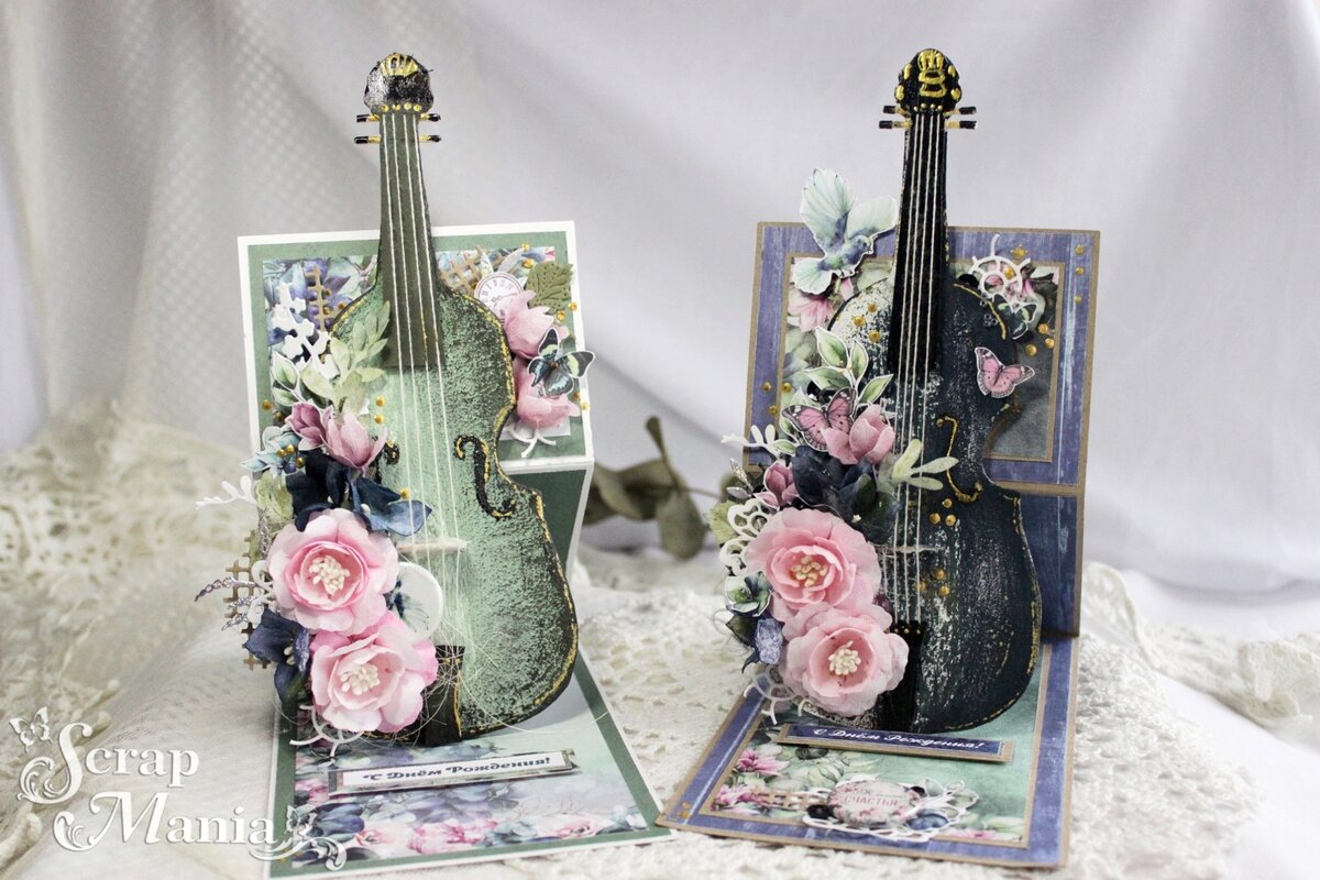 Доброго вам времени суток друзья! Меня зовут Ирина Хедоян. Вот и исполнилась моя мечта стать дизайнером в ДК ТМ ScrapMania. Немного о себе. Любовь к бумажкам началась у меня достаточно давно, ещё в детстве,когда я бережно хранила свои уже исписанные школьные тетрадки, собирала марки, фишки, фантики от различных конфет, заводила дневники.)) Скрапбукингом, как вид творчества, открылся для меня благодаря моей младшей сестре. Она первая стала творить открыточки и влюбилась меня в это дело. Так приблизительно с 2018 года творю и я). Участвовала в различных СП. Хочу сказать, это мне очень нравилось, помогало рости. И вот уже 2023 год. И вот моя первая работа в качестве дизайнера! Вдохновившись палитрой и названием коллекции "Весенний этюд", я решила сотворить две открытки необычной фомы,на которых располагаются скрипки. Почему скрипки? Потому что в музыке этюд является видом муз. жанра.) Следуя палитре, я выбрала два основных тона для каждой работы. Это синий и зелёный. Основой для перво