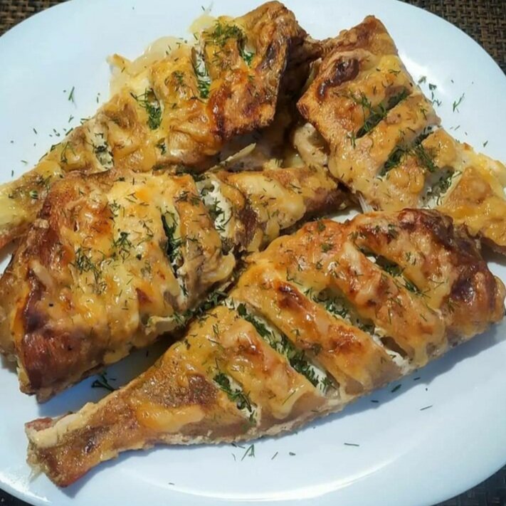 Готовила впервые) Получилось вкусно, получится и у вас!😉 В такой рыбе сохраняются все полезные микроэлементы. Не используется майонез. Ингредиенты: • морской окунь - 4 шт. • лук - 1шт. • растительное масло - 2 шт. • соевый соус - 1 ст.л. • чеснок - 1-2 зубчика • чёрный перец • паприка • карри • базилик и розмарин (по желанию) • сметана - 50 г. • сыр - 50 г. Приготовление: - рыбу почистить, удалить плавники, сделать надрезы - смешать растительное масло, соевый соус, специи и чеснок. Смазать этим соусом рыбу и убрать её в холодильник на 15 минут. - лук нарезать полукольцами. Форму для запекания смазать растительным маслом. Выложить лук, немного подсолив его. - на луковую подушку положить рыбку, смазать сметаной и посыпать сыром. - запекать в разогретой духовке до 180° - 30 минут, до румяной корочки😋 Приятного аппетита! Благодарю за прочтение, комментарии и лайки! Ваша Натуля🥰