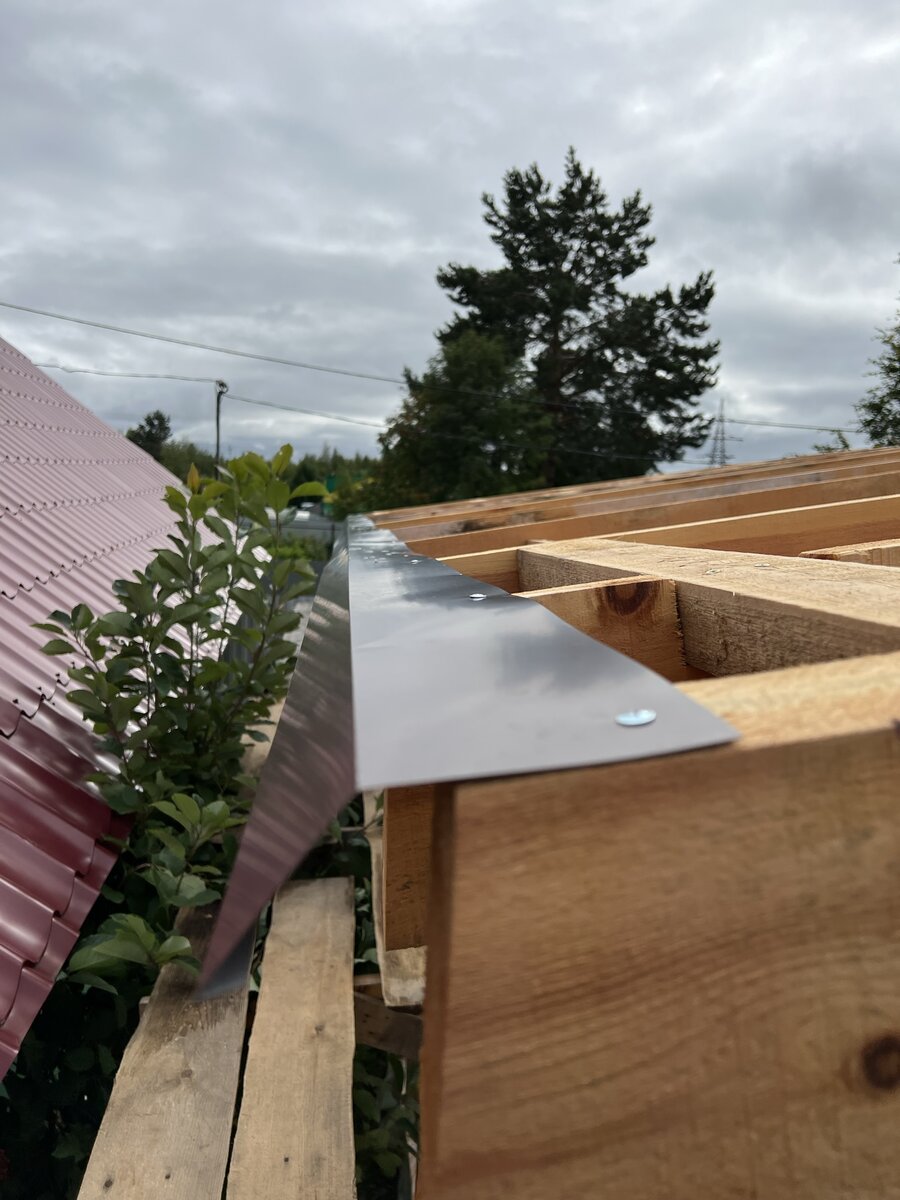 Крыша. Крыша с@ка сложная! И опасная! Эти современные технологии чем думают я не знаю😄 Расклад такой: 1. Капельник. РОВНО крепится к стропилам с небольшим отступом от края, чтобы под него смонтировать сайдинг, закрывающий карнизный свес. 2. Мембранная защита от ветра и влаги. Крепится бутил-каучуковой соединительной лентой к капельнику. Раскатывается по всей площади крыши, соединятся между собой соединительной акриловой лентой. Укладка пленки происходит в нахлест. 3. Контробрешетка. Брус 50х50 мм. Укладывается на стропила. Является вентиляционным зазором для вывода влаги, скапливающейся на мембранной защите от ветра и влаги. 4. Обрешетка. Доска 100х25 мм. (дюймовка). Основа металлопрофиль. 5. Перфорированная ПВХ лента для вентиляционного зазора. Крепится с торца контробрешетки. Перекрывает доступ в подкровельное пространство крупным насекомым (шершни, осы, пчелы, шмели), а так же мелким птицам для выбора укромного места для обустройства гнезд. 6. Кронштейн для водосточного ПВ