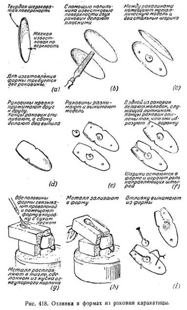 Остаётся ещё один метод отливки изделий, который может оказаться полезным в лабораторных условиях, — отливка в формах из раковин каракатицы. Достоинства этого метода заключаются в его простоте и быстроте изготовления отливки: изготовление и заливка формы отнимают около получаса. Однако отливаемое изделие не может иметь толщину более 6 — 7 мм, ширину более 40 мм и длину более 75 мм. Модель должна быть металлической, так как она подвергается давлению. Конусность может быть весьма мала или даже совсем отсутствовать. Не должно быть шишек. Рис. 418 даёт ясное представление об этом методе. Мягкая известковая поверхность раковины весьма податлива и сохраняет очень чёткий отпечаток любого вдавленного предм