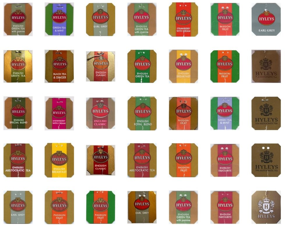 (большой белый ярлык с золотым текстом только на английском) - увеличенный герб треугольной формы с H, заужен к низу, сверху корона, по бокам цветы, снизу лента с надписью Hyleys; текст белого цвета. Нитка крепится узелком через разрез. Имеет 45° скосы по углам. Не отличается в зависимости от вкусов. 31 ярлычок.