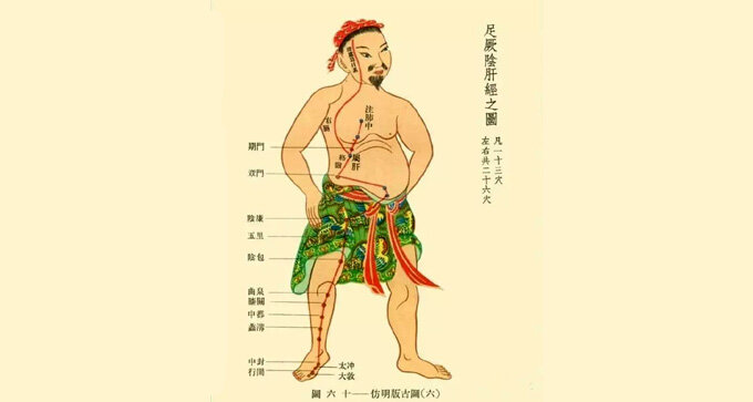 Например, меридиан печени (цзу цзюе инь гань цзин).
