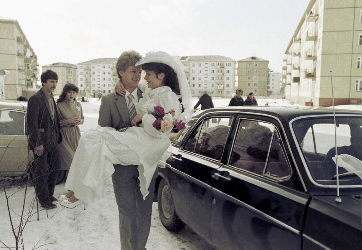 Счастливые молодожены💍 на улице города Радужный❄️ Тюменская область 1986 год. Солидная на то время для свадьбы Черная 24я Волга с самодельными хром молдингами ниже ручки двери 🔧 #дзен #ссср #свадьба #газ24волга #советскаямолодость #ретроавто #ретрофото