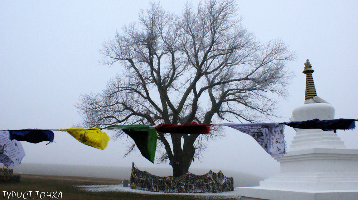 Мы его сразу узнали. Да и как было не узнать? Во-первых, в степи не встретили ни одного другого дерева. Во-вторых, этот тополь просто огромен. И, в-третьих, он окружён ступами и молитвенными флажками.