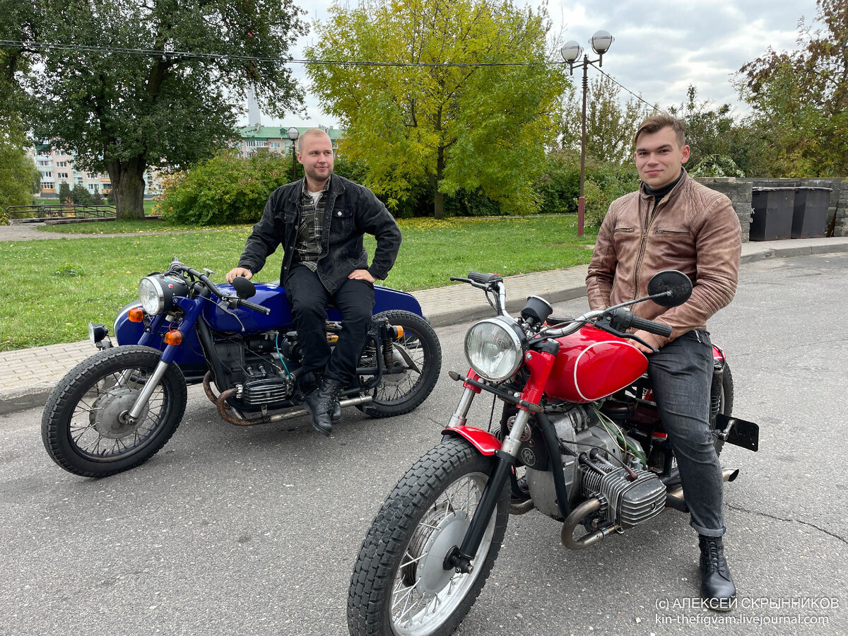 Советские мотоциклы МТ-10 1978 г. (красный) и МТ-11 1991 г. (синий) вместе с хозяевами Александром Зданкевичем и Егором Шаржановичем в Слуцке.