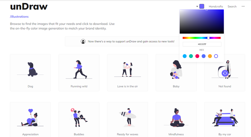Undraw – это большая подборка векторных изображений для дизайнеров и иллюстраторов. Под каждой картинкой на сайте есть описание, что существенно облегчает поиск по ключевым словам, а возможность настраивать цвет делает ресурс универсальным инструментом для любых творческих идей. Картинки доступны для скачивания в форматах SVG и PNG.