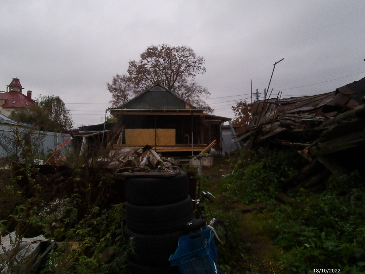 Ещё два дня без дождя и я закрыл фронтон. Чтобы чердак не завалило снегом. Дождь туда и так почти не попадает. Ну и ветер, как раз господствующий ветер у нас с запада (куда смотрит фронтон), и уже в дому стало ощутимо прохладно и весьма ветренно. Поскольку времени до зимы (снега) мало, а дел по подготовке много, решил пока сделать времянку. С дверью на чердак не заморачивался, просто прикрутил лист ОСБ на саморезы. Вообще обшил весь фронтон ОСБшкой, и сверху от дождя ещё натянул тент. Продаются в Мерлене такие тенты строительные... 4х5 метров стоит рублей 700... я его в 2 раза свернул и рейками пришурупил. До весны достоит и ладно. А уж следующим летом сделаю как положено. Сразу в доме стало меньше сквозняков, и ощутимо теплее. Короче, с "верхом" у меня всё. От дождя и снега всё закрыто. Можно переходить к стенам.