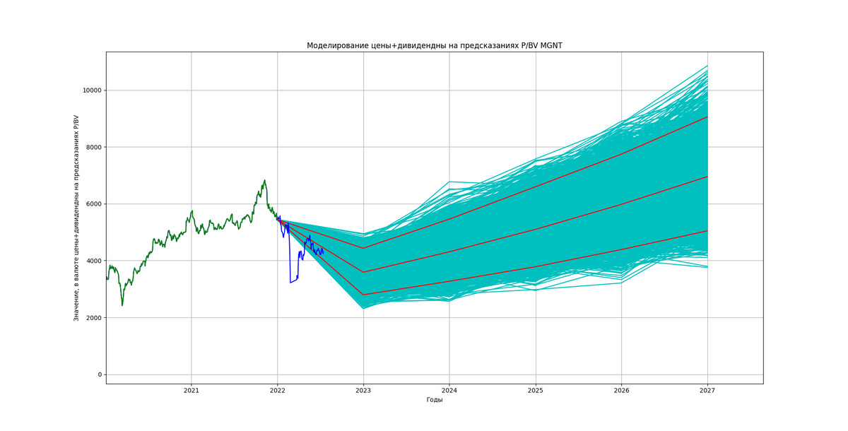 18 июля 2022 на своем закрытом канале ABTRUSTOPSEC я опубликовал прогноз по стоимости акций ПАО Магнит. И там, как я и написал в статье "Прогнозы! Что стоит знать и на что обращать внимание?!", были ожидаемые доходности от инвестиций в данную компанию на горизонт 1, 2, 3, 4 и 5 лет. В долгосрочной перспективе акции выглядели интересно, но в краткосрочной модель показывала возможность падения. На каждый год была рассчитаны вероятности получить убыток, доход до безрисковой ставки, свыше безрисковой ставки но ниже 2 безрисковых ставок, и свыше двух безрисковых ставок.