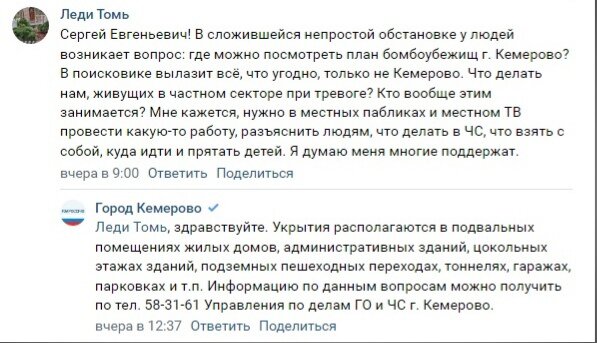 Жители Кемерова интересуются, где в городе располагаются бомбоубежища. Такой вопрос задала жительница Кемерова на официальной странице губернатора Кузбасса Сергея Цивилева во «Вконтакте». Пользователь посетовала на то, что в интернете невозможно найти достоверную информацию о расположении бомбоубежищ в Кемерове, и попросила провести инструктаж с людьми на случай чрезвычайной ситуации. Под ее вопросом появился ответ от городской мэрии. Женщине пояснили, что укрытия размещены в подвальных площадках, на цокольных этажах зданий и в других подземных помещениях. За подробной информацией же попросили обратиться в управление по делам гражданской обороны и чрезвычайных ситуаций.