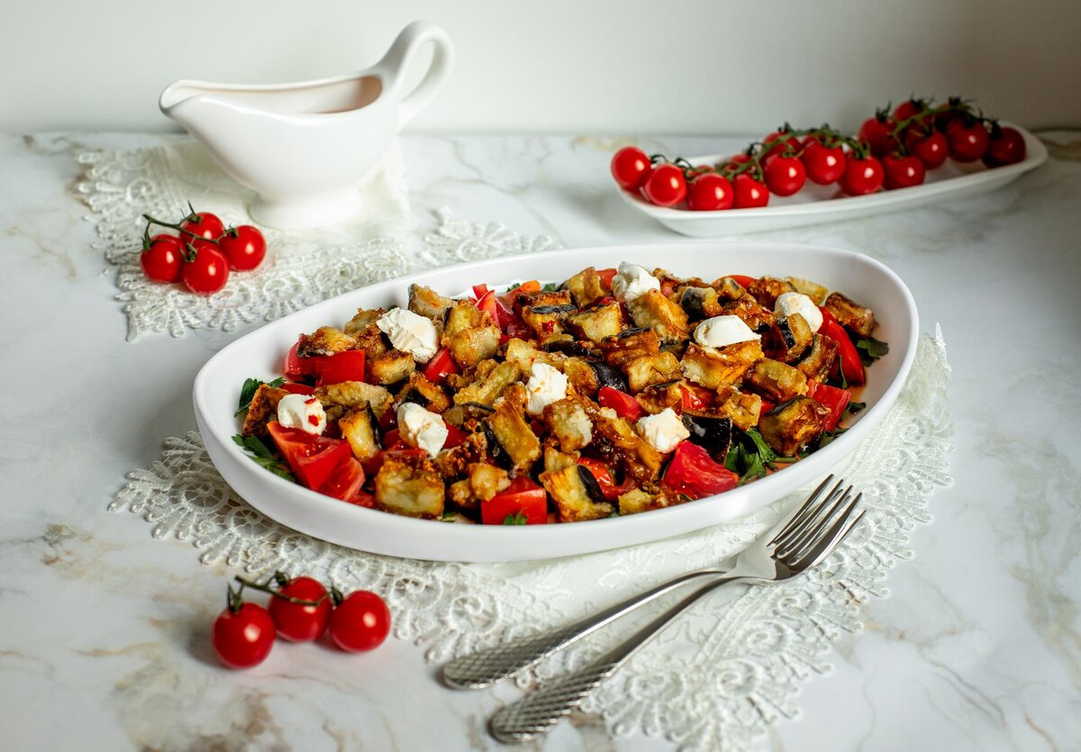 Хрустящие баклажаны с нежным сыром и сочными помидорами – отличная комбинация, особенно вкусная в тех случаях, когда вы используете сезонные плоды. Запасайтесь осенними овощами и возьмите на заметку рецепт яркого салата с баклажанами, которым с нами поделилась Арфине @arfine_m_a, и непременно проверьте его в деле! Ингредиенты: Приготовление: 1. Баклажаны очистите от кожуры, нарежьте кубиками, посолите и обваляйте в крахмале. 2. Обжарьте баклажаны в хорошо разогретом подсолнечном масле до хрустящей корочки. Готовые овощи выложите на бумажное полотенце, чтобы избавиться от лишнего масла. 3. Помидоры нарежьте кубиками, зелень – крупно. 4. Соберите салат – сначала выложите баклажаны, помидоры и зелень. Сверху добавьте ложкой творожный сыр и полейте соусами. Готово! Скорее угощайте близких вкусным сезонным салатом, а для подачи используйте овальное блюдо из коллекции Fine Porcelain – оно прекрасно подойдет для сервировки стола к семейному ужину или празднику. Фото и рецепт: @arfine_m_a В се