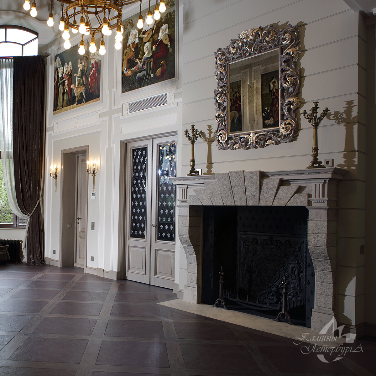 Размер: 2250 x h 1705 x395 Лёгкий, изящный камин, навевающий романтические настроения. Романтическое сознание, ощущения бесконечности мира, - непременное свойство всякого духовного развития человека. Камин лишь отражает мироощущение владельца дома. В этом камине мужская стать и игривость женского веера слились воедино. Немного о создании. Так случилось, что мы работали прежде с архитектором Евгением Парфёновым. Заказчиков мы тоже знали по предыдущим работам. Новый проект вызвал у меня неподдельный интерес. Нам предстояла большая работа. Начали с осмысления, знакомства с идеей. Предложили привезти мрамор из Германии, на карьере по нашей просьбе был добыт однородный по цвету и фактуре мрамор Jura Grey определённого 16 слоя. Мрамор использован не только для создания камина, но и для кронштейнов под потолочными балками, для колонн, подоконников, и так далее. Мрамор как бы задаёт тон. С одной стороны, он прост, но благороден. На нём прекрасно