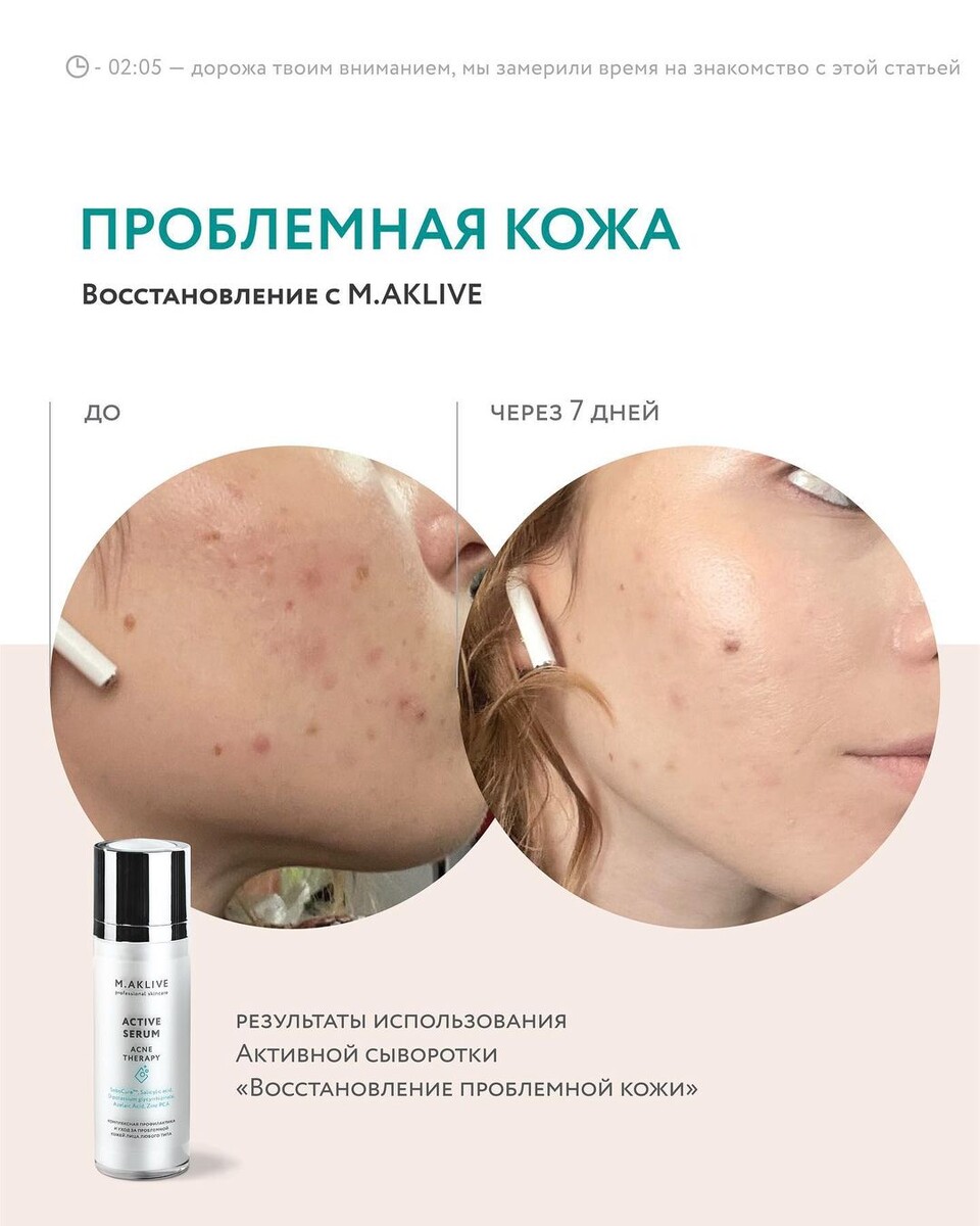 Посмотрите, как поработала на коже Активная сыворотка M.AKLIVE «Восстановление проблемной кожи»! Всего за 7 дней применения уменьшено количество воспалений и покраснений, тон кожи стал ровнее. Сыворотка действует на основные причины несовершенств на коже лица и тела. При регулярном применении позволяет добиться устойчивого результата, так как берет под контроль факторы, вызывающие воспаления и обладает успокаивающим и заживляющим действие: Уменьшает активность бактерий C.acnes > Меньше воспалений