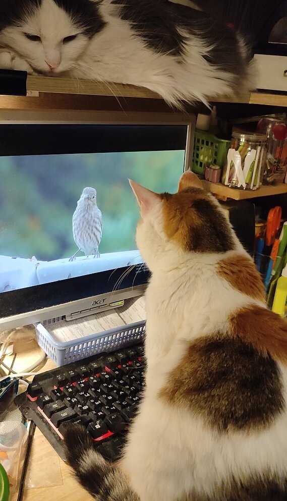 Я такая, оказывается, отсталая!🙀 Ну просто прошлый век!😁 Только недавно узнала что существуют специальные видео игры для кошек и даже кино. Но хоть я и отстаю от мирового прогресса но когда обнаруживаю что-то новое, то уже очень хочу это новое опробовать. В это раз от моей тяги к прогрессу "пострадали" Соня и Мартин. Ну как пострадали.... По-моему наоборот, их жизнь заиграла новыми красками! Хотя, поначалу я вообще-то скептически была настроена, но нашла все же в интернете несколько таких кошачьих "киношек". У меня были огромные подозрения что уж мои умудренные весомым жизненным опытом и утомленные многолетней практикой реальной охоты на настоящую дичь в естественной природе кошки вот совсем не заинтересуются какой-то там нарисованной мышкой, которая даже добычей не пахнет. Но все же решила попробовать. Сначала включила видео игру для кошек "Поймай мышку". И стала наблюдать. Скучающая до этого Соня тут же нарисовалась на моем столе и устроилась напротив монитора. И вот что получило