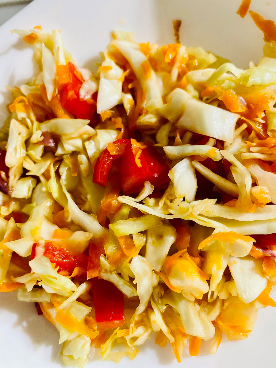 Самый простой салат из самых простых ингредиентов. Я помню и люблю его еще со времен школьной столовой. Его рецепт знают все, но я хочу записать его здесь для себя и потомков)) Точных пропорций не будет. Пространство для творчества) Ингредиенты: Капуста (половина маленького кочана), Морковь (1 шт), Болгаркский перец (1 шт), Лук красный (1/4 шт) Заправка: Соевый соус (2 ст л), Яблочный уксус (1 ст.л), Кунжутное масло (1 ст.л), Приправы, соль по вкусу Процесс: 1. Лук мелко порезала и предварительно замариновала в уксусе 2. Капусту нашинковать, морковь натереть на крупной терке, перец нарезать, все смешать в миске, посыпать солью и чуть-чуть помять руками 3. Для заправки смешать все ингредиенты и перемешать 4. В миску добавить лук и заправку. Готово.