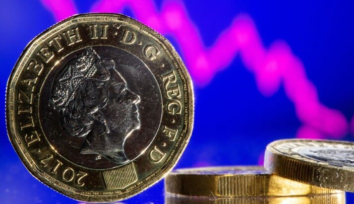 На этой иллюстрации, сделанной 9 ноября 2021 года, видны монеты британского фунта стерлингов перед отображаемым биржевым графиком. REUTERS/Dado Ruvic/Illustration