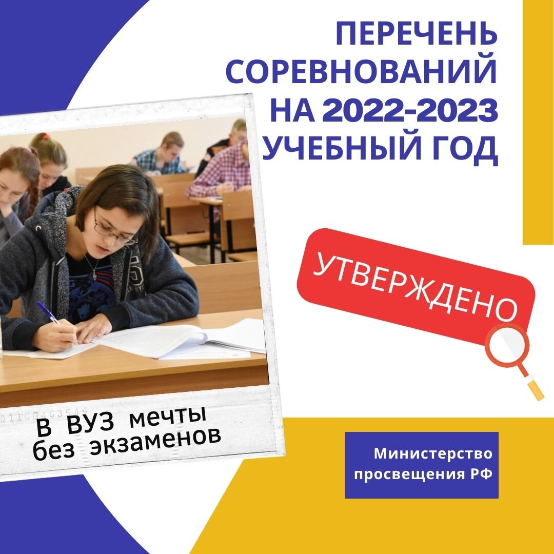 Министерство просвещения Российской Федерации утвердило перечень соревнований на 2022-2023 учебный год, победители и призеры которых могут претендовать на льготы при поступлении в профильные ВУЗы. В список вошли 615 олимпиад и конкурсов по профилям наука и образование, культура и искусство, физкультура и спорт. По каждому профильному направлению уровни присуждаются в зависимости от содержания, профессиональной квалификации специалистов, которые обеспечивают судейство и подготовку команд, организационно-методического обеспечения мероприятий и т.д. Чем выше уровень, тем больше льгот и преимуществ получает участник. В числе преференций: поступление в вузы по профилям без экзаменов, баллы за дополнительное вступительное испытание или 100 баллов за ЕГЭ. В перечень вошли: Всероссийская олимпиада школьников, Олимпиада Innopolis Open, Всероссийская олимпиада по судостроению, Университетская олимпиада школьников «Бельчонок», Вузовско-академическая олимпиада по информатике, III Межрегиональный