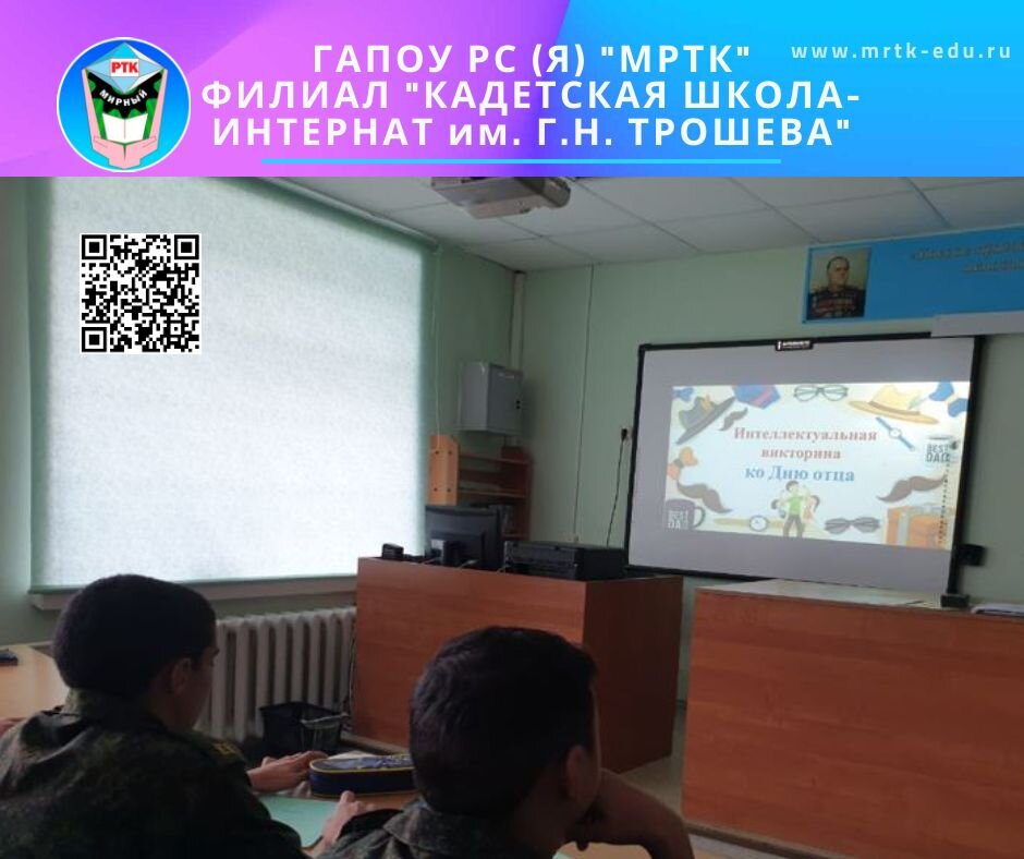 Интеллектуальная викторина ко Дню отца в «КШИ им. Г.Н. Трошева». 17 октября 2022 года в ГАПОУ РС (Я) «МРТК» филиале «Кадетская школа-интернат им. Г.Н. Трошева» проведена интеллектуальная викторина ко Дню отца в 7 классе. Цель мероприятия: укрепление семейных ценностей и повышение значимости отцовства в становлении института семьи; воспитание у детей чувства гордости за своих отцов и уважения к ним. Задачи: созданию эмоционально положительного настроя детей; воспитывать любовь и уважение к родителям. В нашей стране появилась традиция отмечать День отца в третье воскресенье октября с 2021 года официально. Это праздник любви и уважения к отцу. Ребятам были предложены интересные вопросы и задания, ярко-красочная презентация. Эржена Хорёнова, зам. начальника по ВР. Пресс-служба ГАПОУ РС (Я) «МРТК» филиал «Кадетская школа-интернат им. Г.Н. Трошева». #КадетскаяшколаинтернатимГНТрошева #КШИТрошева #кадеты #Чернышевский #МРТК #Мирнинскийколледж #Якутия #Мирнинскийрайон #Образование #Разговорыо