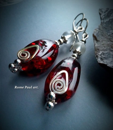 Материалы: горный хрусталь (Австрия, 8 мм), калёный бернит (сплав натурального балтийского янтаря и ювелирных смол, 17*27 мм), фурнитура - гипоаллергенный ювелирный мельхиор Длина серьги: 75 мм ...Иногда бывает так, что размеры и форма янтарных кусков вполне подходящие, но вот цвет требуется сделать более насыщенным, изменить. Или стоит цель получить янтарь более яркого цвета, усилить привлекательность. В таких случаях помогает прокаливание природного янтаря и добавление ювелирных смол для усиления декоративных данных... Так рождается бернит. ...Отсортированные по своим внешним цветовым качествам янтарные кусочки предварительно обесцвечивают, выдерживая под давлением в автоклавах по 16 часов при температуре 250 градусов по Цельсию. Далее куски янтаря отправляются в профессиональные печи, содержащими морской песок, где поддерживается температура свыше 200 градусов по Цельсию. Таким образом, можно получить различную окраску камня – от лимонной до вишнёвой. Получение нужного цвета регулир