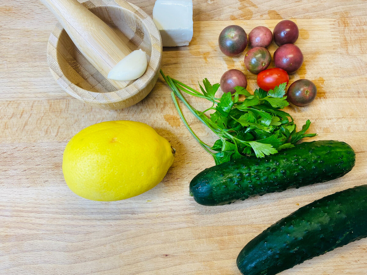Подготовим продукты. На понадобится: фета, огурцы, помидоры, чеснок, растительное масло, лимон и петрушка.