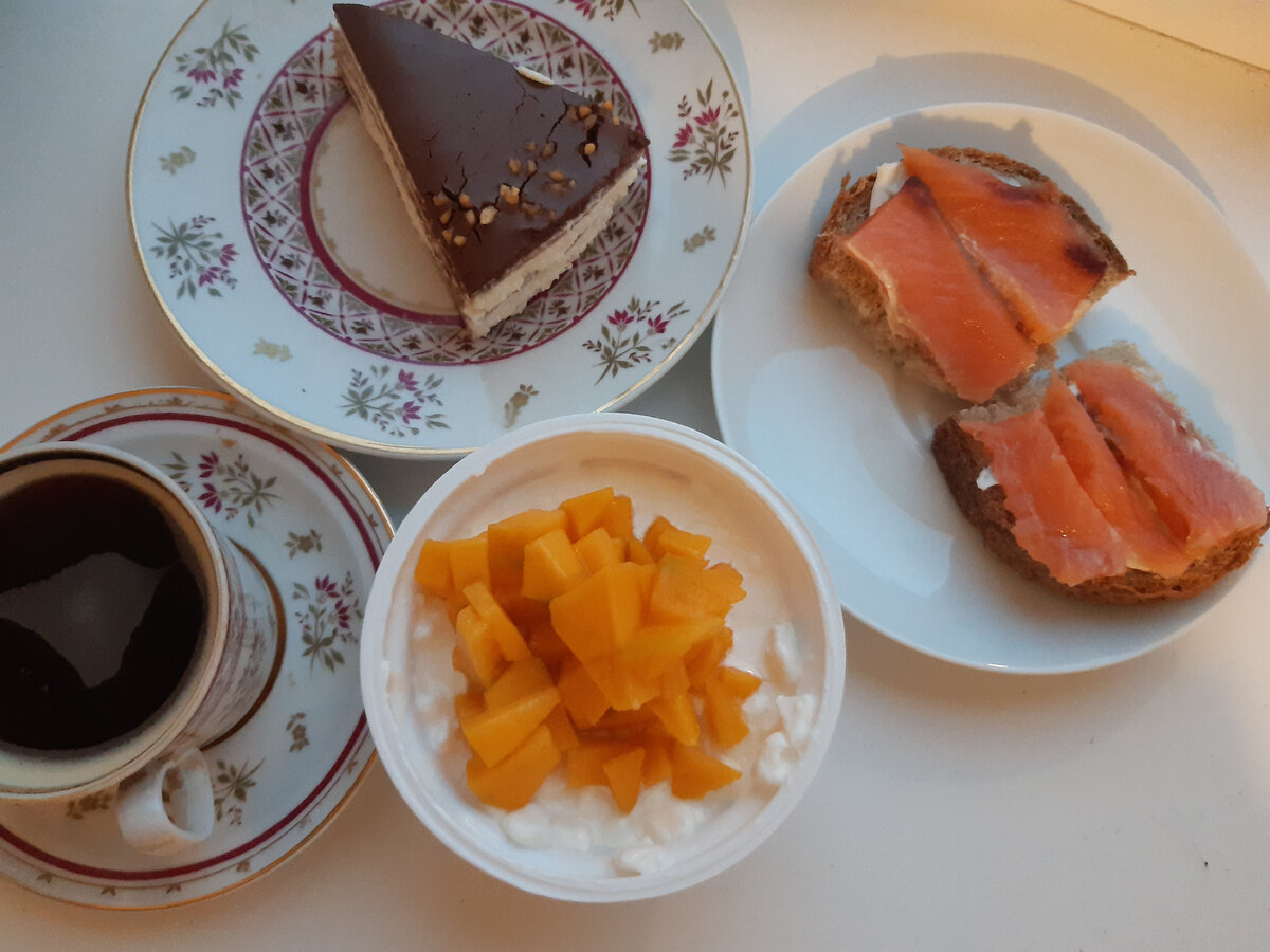 завтрак очень вкусный сегодня: бутерброды с кижучем малосольным, зерновой творог в сливках с манго из Вкусвилл, оттуда же блинный тортик. И плюс моя традиционная утренняя чашка кофе эспрессо. Сейчас пью БЭРРИ и мне очень нравится этот кофе.