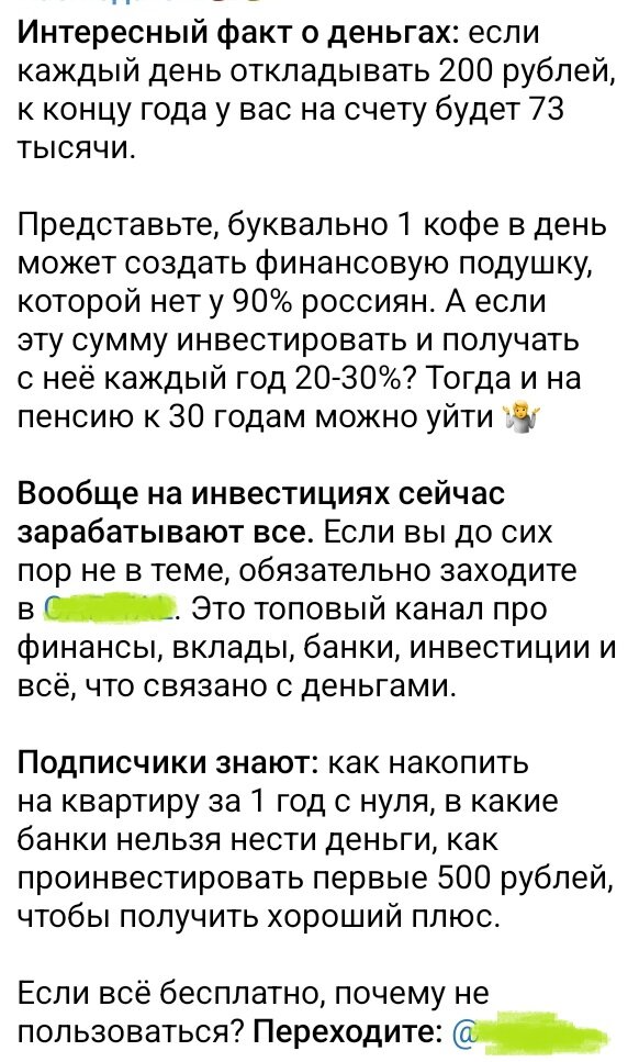Прокомментирую один пост – очень уж часто такое (написанное как под копирку, но в разных источниках) стало попадаться на глаза. Вдруг, кто еще сомневается. «Откладывай 200 рублей в день, и через год у тебя будет 73 000 рублей!». Да, снова навязчивая реклама инвестирования чашек плохого кофе (хороший уже не 200 стоит). «А если эту сумму инвестировать и получать с нее каждый год 20–30 %? Тогда к 30 годам и на пенсию можно будет уйти». Дальше реклама какой-нибудь группы по инвестиции. Давайте по порядку. Во-первых, сумма 73 000 р. (абсолютно реальная, если 200 р. умножить на 365 дней, это единственная правда в этом посте) впечатлить может разве что школьника. В 2022 году любой работающий человек со взрослыми обязанностями (дети, ипотека или квартплата, покупка еды) понимает, что сумма 73 000 р. незначительна, что на нее не сделаешь вообще ничего. Даже отдохнуть в России нельзя. Кстати, подозрение о том, что это реклама для школьников, я еще обосную. Дальше смешное. А если инвестироват
