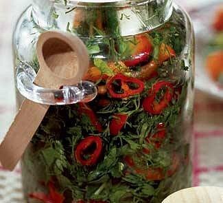 2. Зелень измельчить. Перцы вымыть, очистить от зерен и плодоножек и тонко нарезать. Все хорошо перемешать в большой миске. Добавить соль и еще раз перемешать.