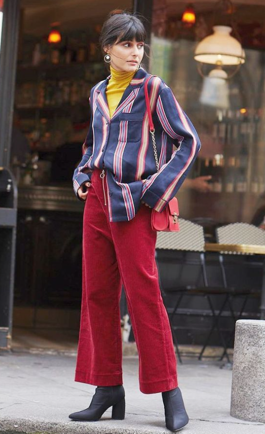 Важно помнить о таком нюансе, как соразмерность деталей образа: если в ансамбле используются брюки длиной в пол, сшитые из довольно плотной ткани (твид, деним и пр.), то лучше всего они будут смотреться с довольно массивной обувью.