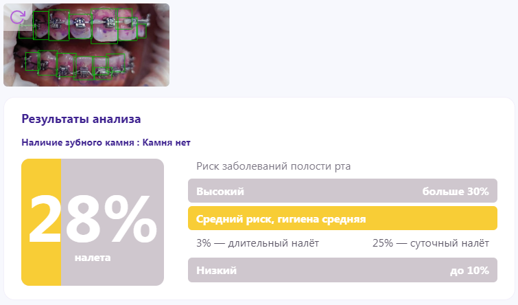После анализа фотографии окрашенных зубов программа DIANA определила уровень гигиены и риск развития заболеваний полости рта - у пациента средняя гигиена и средний риск. Присутствует суточный налет, который покрывает 25% поверхности зубов, и 3% длительного налета. Налет располагается преимущественно в области крепления брекетов и дуги. Ношение брекетов обязывает пациента соблюдать все рекомендации врача, в том числе проведение тщательных гигиенических мероприятий. Несъемная конструкция значительно затрудняет чистку зубов. Длительное скопление налета может способствовать развитию кариеса и его осложнений, что приведет к необходимости прервать ортодонтическое лечение. Чтобы не допустить подобного сценария, врач должен научить пациента правильно проводить чистку зубов, назначить необходимые средства и регулярно контролировать уровень гигиены. DIANA помогает справиться со всеми этими задачами. Благодаря анализу фотографии зубов с окрашенным налетом удается объяснить и показать пациенту мес