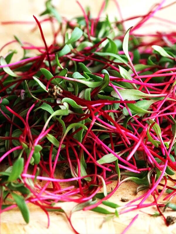 Молодая ботва свеклы имеет сладковатый свекольный вкус и очень быстро усваивается организмом. Тонизирует и освежает в любых блюдах. В микрозелени свеклы содержится участник «гормона счастья» — триптофан, а также микроэлементы, укрепляющие зубную эмаль. Обычно свежие ростки свеклы добавляют в овощные салаты или витаминные смузи.