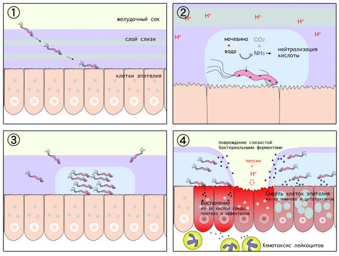 В этих условиях бактерии живётся комфортнее, но она не останавливается на этом и вырабатывает ферменты, которые разрушают слизь. Слизь является, по сути единственным защитным фактором слизистой оболочки от разрушительной соляной кислоты. Таким образом, кислота начинает непосредственно воздействовать на слизистую оболочку и попросту сжигать её (химический ожог слизистой).