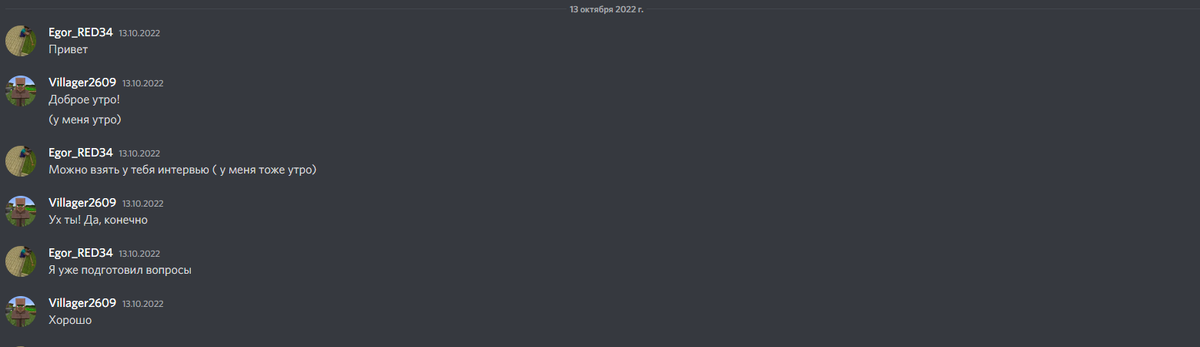 Всем привет! Как вы знаете житель выложил со мной выложил интервью. кстати вот ссылка. мы с ним попереписывались в дискорде... Кстати вот его аватарка Итак начинаем, я ему задал 10 вопросов, было очень интересно, не будем томить, начинаем! 1 вопрос: Почему ты так назвал канал? 2 вопрос: Какой твой любимый блок? 3 вопрос: какой нейтральный моб твой любимый? 4 вопрос: играешь ли ты ещё в какие-то игры? Если да, то в какие? 5 вопрос: Как ты познакомился с Майнкрафтом? 6 вопрос: Какие планы у тебя на канал? Есть ли у тебя цель 7 вопрос: Какой твой любимый биом (деревня не считается)? 8 вопрос: что бы ты хотел добавить в Майнкрафт? 9 вопрос: Как ты считаешь, почему у жителей большие носы? 10 вопрос (последний): Ты играешь на серверах? Если да то на каких? Фухх, житель спасибо тебе что ты согласился взять интервью, но ты не один был на примете, если мои подписчики наберут под этой статьёй 6 лайков, я сделаю новое интервью вот ссылка на канал жителя: ссылочка :3 Ну, а на этом всё, сег