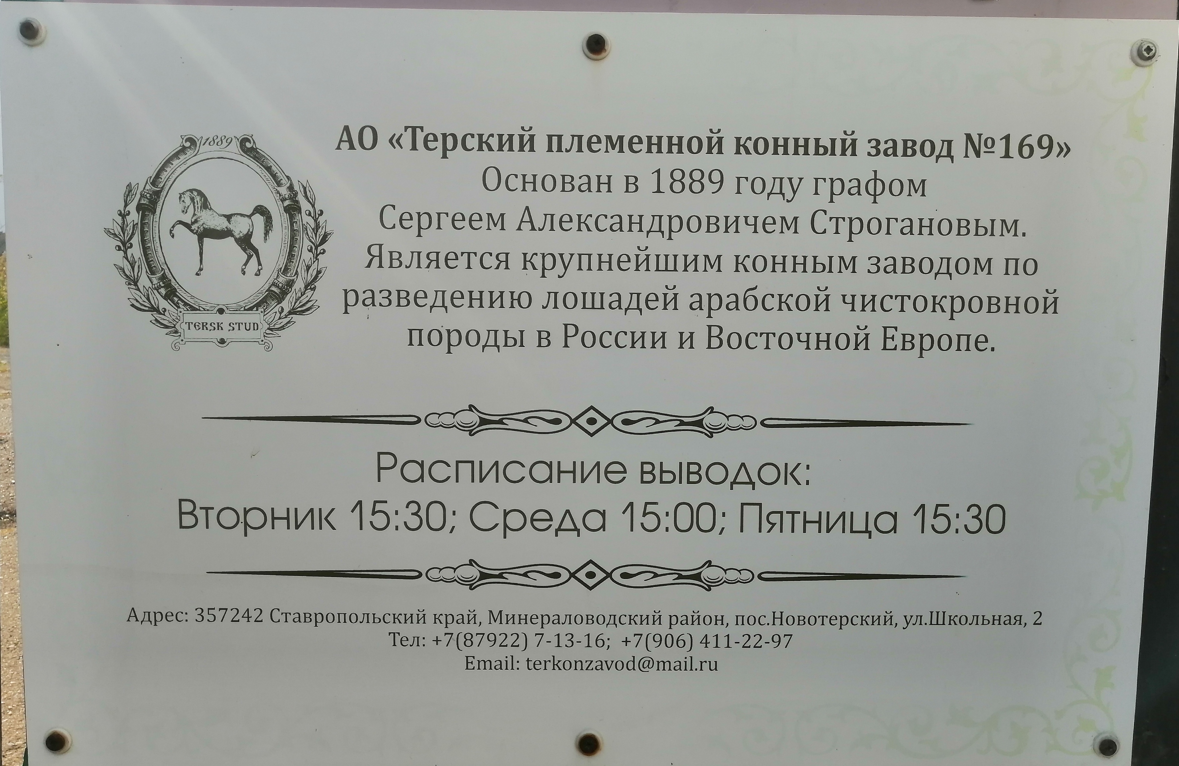 Терский конзавод №169 находится возле МинВод, добраться можно на своей машине, такси или купить трансфер от турфирмы (который у нас так любят называть экскурсией)). Такси у нас ощутимо подорожало в этом году, поэтому купила трансфер за 700 рублей + 200 рублей за саму экскурсию нужно заплатить уже на заводе. А вообще при желании можете сами приехать, вот расписание по состоянию на сентябрь 2022: