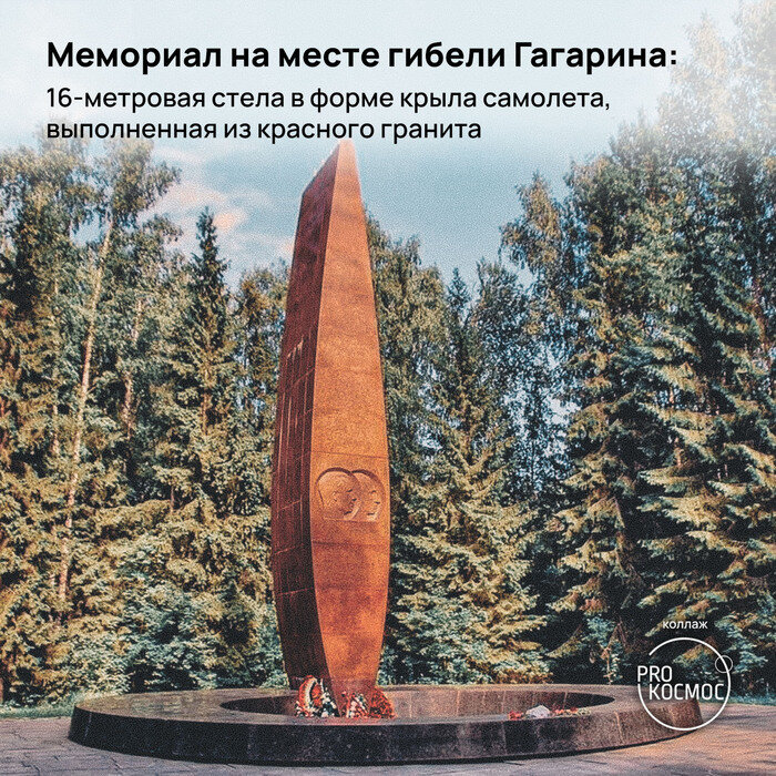Мемориал на месте гибели Гагарина: 16-метровая стела в форме крыла самолета, выполненная из красного гранита