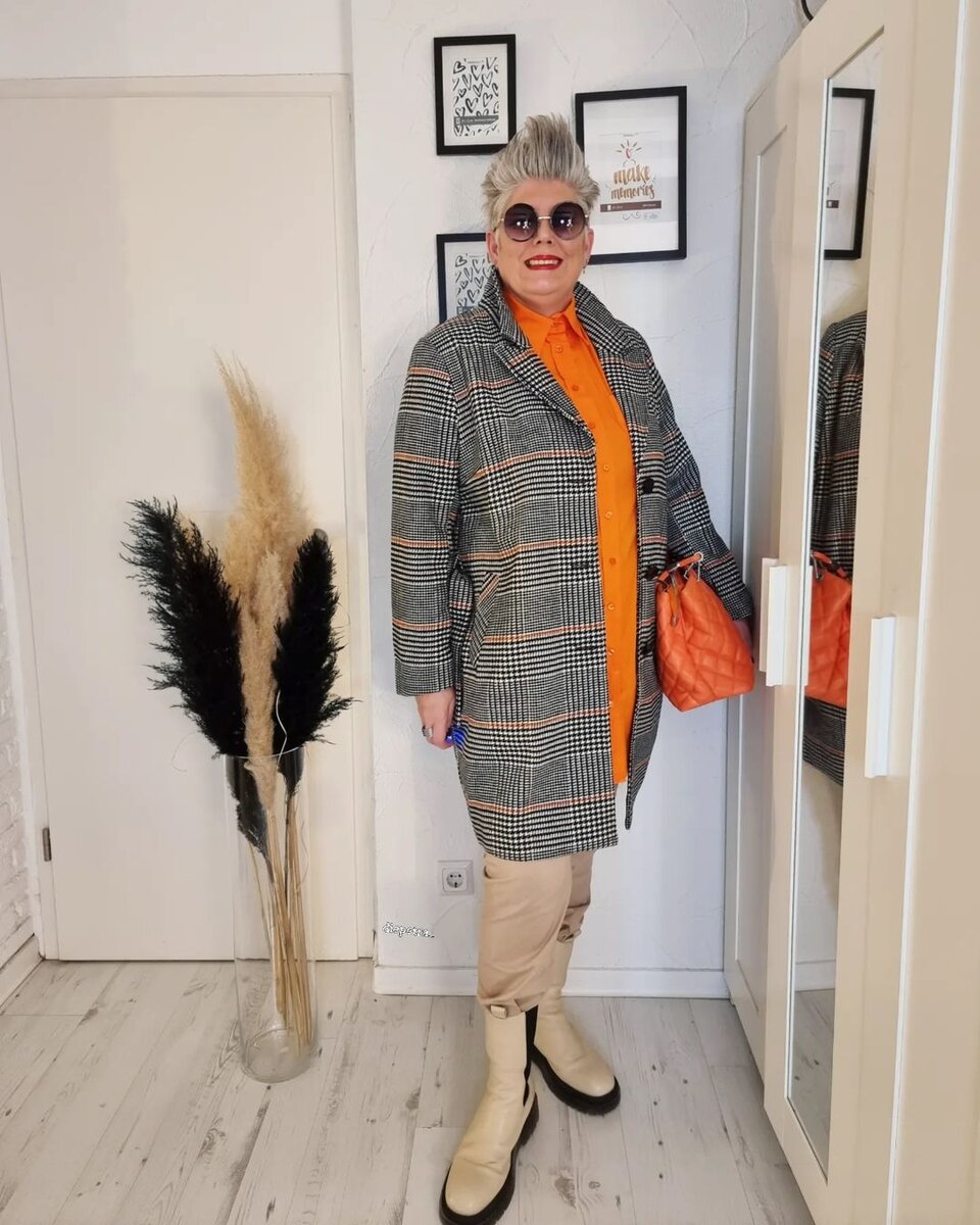 Многие дамы с формами испытывают сложности при выборе одежды, но только не наша сегодняшняя героиня. Блогер из Германии умело сочетает классику с трендами, при этом не забывая подчеркивать сильные стороны своей фигуры. Ниже подборка актуальных осенних образов от модницы корпулентного телосложения. Цветная рубашка + бежевые брюки + клетчатое пальто – комфорт и стиль в одном флаконе. Морковная сумка и ботинки челси ничуть не выбиваются из модного ансамбля. Зрелая немка в свои 50+ не отказывается от кожаных вещей. Посмотрите, как красиво сочетаются кожаные брюки, жакет и трикотажный свитер с воротником поло. Дополнительные детали: принтованный шарф, сумка из кожи, ботинки, очки. Пальто рубашечного кроя – универсальная модель, которая хорошо «сидит» на любой фигуре. Красная сумка стала ярким акцентом всего образа, а длинный теплый шарф сделал осенний комплект уютнее. Не хуже пальто-рубашка смотрится в двухцветном образе. Пальто, полосатый свитер, черные брюки, сапоги, компактная сумка и ни