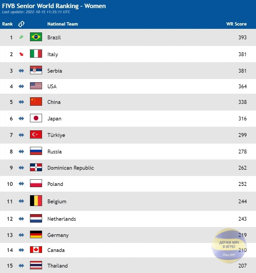 15 октября FIVB опубликовала обновленный рейтинг женских сборных. Его возглавили волейболистки из Бразилии, следом идёт Италия и Сербия. —
