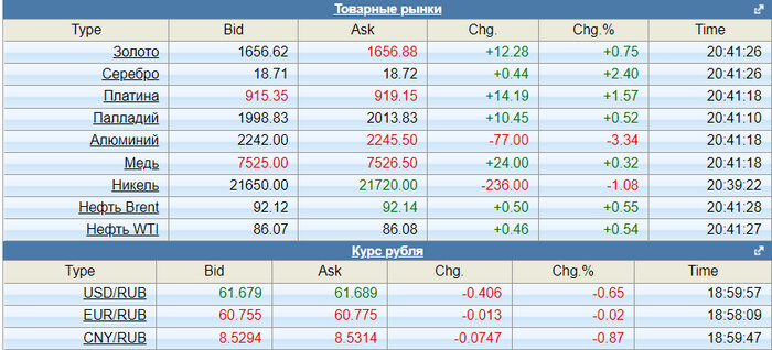 Товарная и валютная биржа: Всё хорошо. Рубль в середине коридора, золото подрастает, серебро тоже. Нефть на комфортном уровне, Urals - 70, 2. Газ ТТФ - 1252.