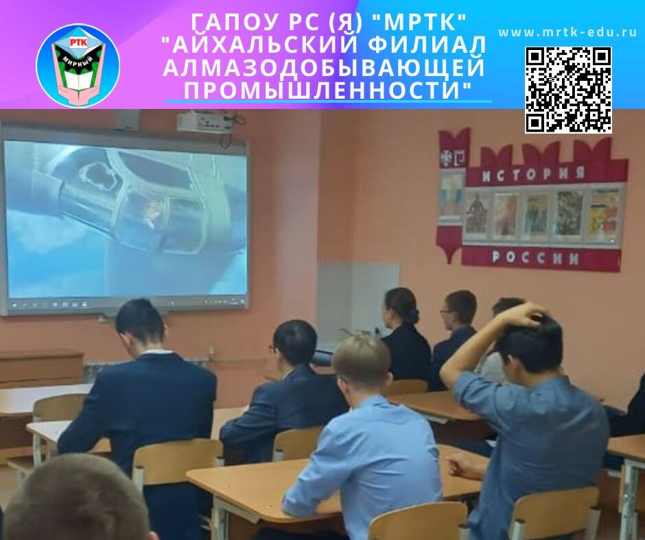 Всероссийский открытый «Урок мужества» в «Айхальском филиале алмазодобывающей промышленности». Социальные сети МРТК: подпишись и живи ярко! 17 октября 2022 г. студенты «Айхальского филиала алмазодобывающей промышленности» МРТК включились в акцию проведения Всероссийского открытого «Урока мужества», посвященного памяти воинов, погибших во время участия в специальной военной операции России на Украине. Целью открытого урока – ознакомление обучающихся с примерами героизма и мужества различных поколений защитников Отечества, оказание поддержки участникам специальной военной операции. Ребята с замиранием сердца смотрели на подвиги наших солдат, которые со словами «Я умираю, но не сдаюсь!» являлись примером героизма и самоотверженности. Современные Герои встанут в один ряд со своими дедами, защитившими Родину в Великую Отечественную войну! Светлана Маслюкова, заместитель заведующей по УВР АФАП. Пресс-служба ГАПОУ РС (Я) «МРТК» «Айхальский филиал алмазодобывающей промышленности». #Айхальскийф