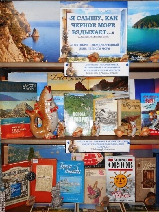 «Где море поет, подперев небосклон, и зеркалом служит звезде, – лишь здесь я познал превосходство морей над нашею тесной землей» – эти поэтические строки Н. Заболоцкого стали цитатой-лейтмотивом краеведческой выставки-коллажа «Я слышу, как Черное море вздыхает», в название которой вошли строки стихотворения «Мелодия моря» Андрея Дементьева. Выставка-коллаж организована библиотекой-филиалом №4 им. М.М. Коцюбинского ЦБС для взрослых Симферополя в преддверии Международного дня Черного моря, ежегодно отмечаемого 31 октября. В рубрике «Я рисую море, голубые дали. Вы такого моря просто не видали!», в название которой вошли добрые строки В.Н. Орлова, представлены репродукции «великого певца моря» И. Айвазовского, прославившего Черное море своими шедевральными полотнами «Пушкин на берегу Черного моря», «Лунная ночь на Черном море», «Буря на Черном море» и др. Глядя на репродукцию И. Айвазовского «Смотр Черноморского флота в 1849 году», знакомясь с представленным на выставке фотоальбомом «Город