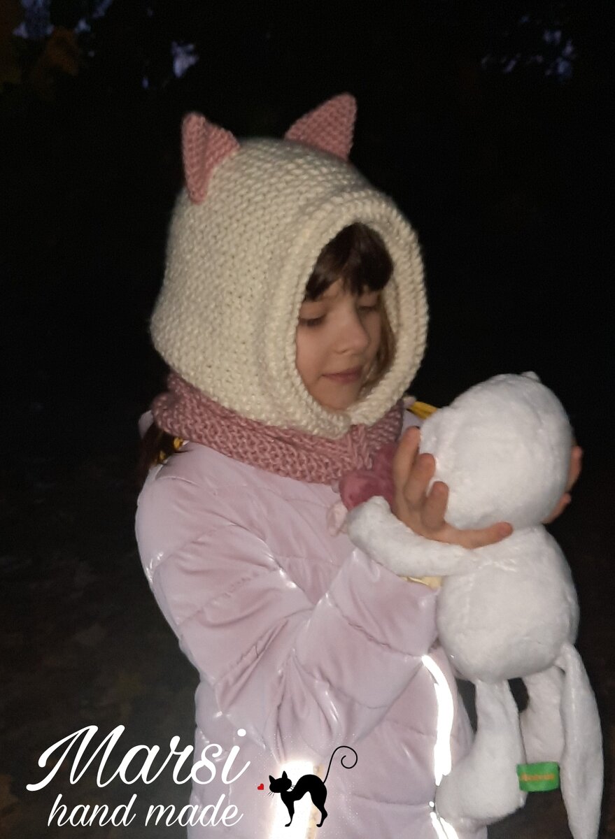Капюшон-снуд готов. Без переделок, не обошлось. В мастер-классе (давала ссылку на него здесь ) вяжется отдельно снуд и капюшон, а затем вместе сшиваются. У меня это выглядело слишком грубо, и я пошла другим путем. По краю готового капюшона набрала петли на снуд, так мне нравится больше. Обладательница такого головного убора счастлива, теперь хвостику ничего не мешает. Расход: на капюшон ушло 1,5 мотка ниток, на снуд, ушки и шнурок ушло так же 1,5 мотка ниток. Если понравилась публикация подписывайтесь и ставьте 👍 Ведь это лучшая награда за труд и помощь в развитии канала. Хорошего дня❤