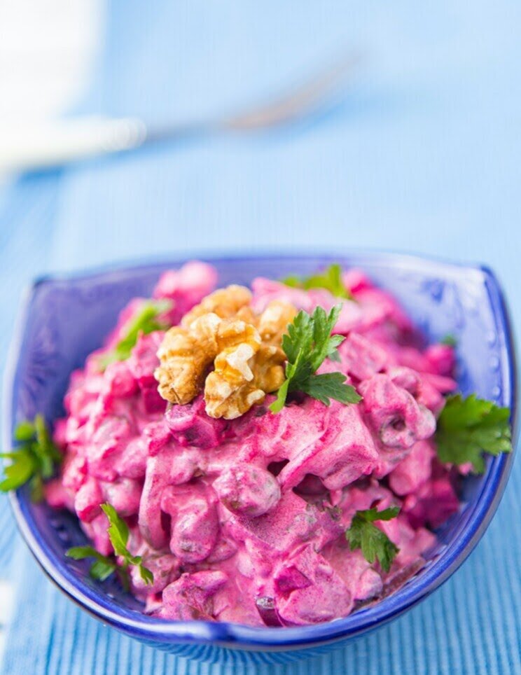 Остренький, сливочно-нежный, аппетитный, с сочной чуть похрустывющей свеколкой, с легким звонким ароматом чеснока это наш любимый салат осени и зимы. Научили готовить по новому рецепту, всю прошлую осень и зиму со стола не уходил. И в этом тоже, вероятно - новых рецептов с таким салатом и не нужно: хорош, так приготовить стоит. Что может быть нового в свекольном салате? Кроме свеклы - новая заправка, которая и создает весь невероятно аппетитный вкус. Готовим свекольный салат по-новому: рецепт + ингредиенты 1) Свеклу отварить до готовности - при желании запечь в духовке. Это даже лучше: лучшая консистенция - свеколка более плотная и менее водянистая, сахарная, сладкая становится - и очень ароматная. Хотя и отваренная хороша :) 2) Нарезать свеклу мелкими кубиками или натереть на терке. Или пропустить через мясорубку - можно готовить любым методом: все хороши. Можно по настроению готовить, разными методами - сохраняя лишь заправку для салата. 3) Чеснок пропустить через пресс ли мелко нару