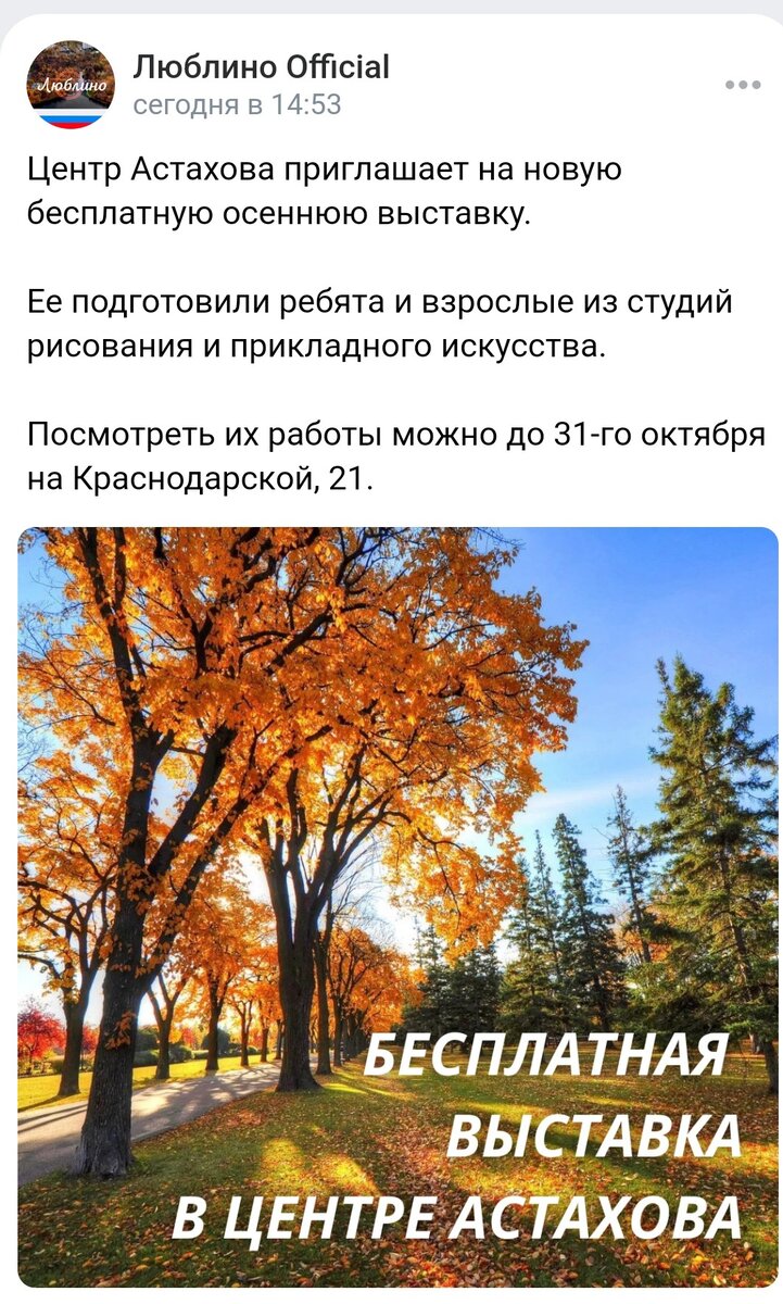 Доброе время суток! На днях я ВКонтакте увидела вот такое сообщение. Сегодня я побывала на этой выставке. Центр не большой, расположен в желчном доме. Меня любезно встретила Ольга Юрьевна. Заведующая сектора №3 КЦ им Астахова. Я попала в центр в первой половине дня. Детей не было. Не смотря на то что я была одна, Ольга Юрьевна мне не отказала в экскурсии по центру. В помещении уютно, тепло, чисто. Студии не большие, светлые. Название выставки. Выставка не большая. Много интересных работ. Рисунки в основном детские. Есть рисунки с историей. Историю этой картины мне рассказала Ольга Юрьевна. Картину нарисовала девочка Марина. Тема рисунка, если я не ошибаюсь,, чем я занимался летом,, На этой картине изображена сама Марина. Она сидит около железнодорожных путей и смотрит на мимо происходящее поезда. Мечтая о путешествиях. Мне понравилась вот эта картина. К сожалению я не запомнила автора. Но, что-то в этой картине есть необычное. КЦ есть так же студии скульптуры. Ребята лепят из скульпт