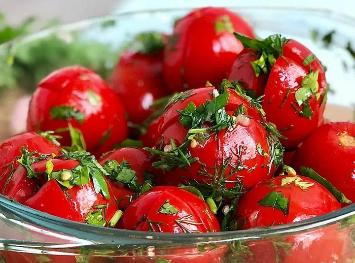 Продолжаем квасить овощи, теперь это помидоры. Вкусно, красиво и натурально. Ингредиенты : Помидоры - 2 кг Перец сладкий - 2 шт Перец Чили - по вкусу Чеснок - 250 гр Соль - 30 гр Сахар - 30 гр Чёрный перец молотый Способ приготовления : Помидоры помыть и надрезать не до конца, а вдоль, чтобы вкладывать начинку. Перец сладкий нарезать на любые кусочки, можно и крупно . Чеснок измельчить или натереть на мелкой тёрке. Перец Чили мелко порезать. Зелень измельчить. Зелень, чеснок, соль, сахар, молотый перец сложить в миску и хорошо перемешать. Этой начинкой начинаем фаршировать помидоры. Помидоры складываем в кастрюлю или глубокую ёмкость, в которой будут кваситься помидоры. Перец сладкий перекладываем слоями с помидорами и так до конца. Сверху на помидоры кладём тарелку и ставим грузик, примерно это может быть банка с водой. Так помидоры стоят два дня в комнатной температуре. На второй день раскладываем в банки и заливаем рассолом из помидор. Из этой порции получится одна 2