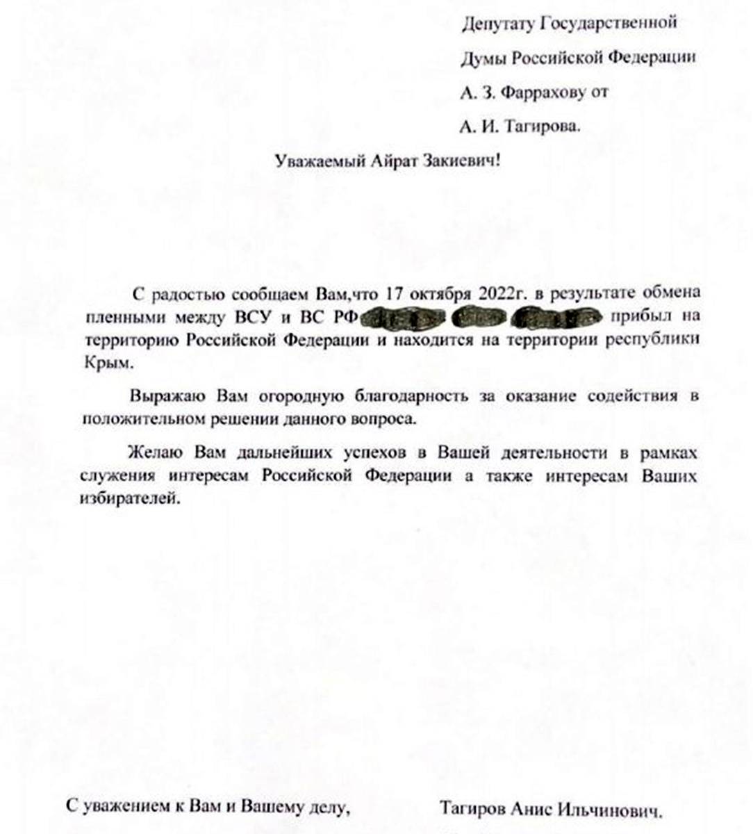Депутат Государственной Думы РФ от Татарстана Айрат Фаррахов сообщил, что из украинского плена был освобожден военный медик из Мензелинска. Об этом Фаррахов рассказал в своем Telegram-канале. Медик попал в плен под Лиманом, когда оказывал помощь сослуживцам. Военнослужащего удалось освободить во время обмена пленными между ВСУ и ВС РФ, которое состоялось накануне. «Мы проработали этот вопрос по нескольким каналам. Огромная благодарность Министру обороны РФ Сергею Шойгу, моему коллеге Андрею Картаполову и всему мусульманскому сообществу Татарстана», – написал Фаррахов. Ранее «Татар-информ» сообщал, что накануне Россия провела обмен пленными с Украиной по формуле «110 на 110». Об этом сообщил в своем Telegram-канале врио главы Донецкой Народной Республики Денис Пушилин.