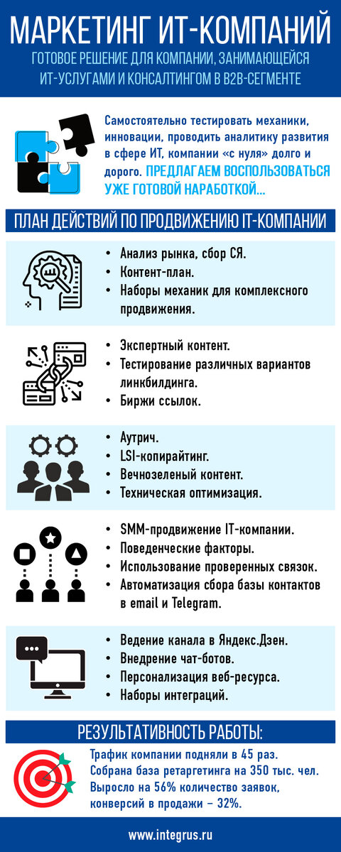 Рынок компьютерных услуг характеризуется высоким ценником, наличием многочисленных конкурентов и сложными для понимания потребителя продуктами. Быстро привлечь трафик и инвестиции удается за счет использования комплексного маркетинга для ИТ-компании. Самостоятельное тестирование механик, инноваций и проведение аналитики в ИТ-сфере требует значительного времени и огромного бюджета. Однако есть уже апробированные наработки, способные повысить трафик более чем в 30 раз! Кейс по продвижению Компании, занимающейся оказанием ИТ-услуг и консалтингом, потребовалось увеличить трафик и конверсий в продажи. Менеджеры использовали приемы обычного маркетинга, при этом отсутствовала маркетинговая стратегия, не было понимания своей целевой аудитории, сайт не приносил заявок. Для реализации комплексного маркетинга и достижения удовлетворяющего клиента результата были предприняты следующие шаги. Выбор наборов интеграций (Roistat, Битрикс24, Albato, Telegram). Результат реализации кейса для ИТ-компании