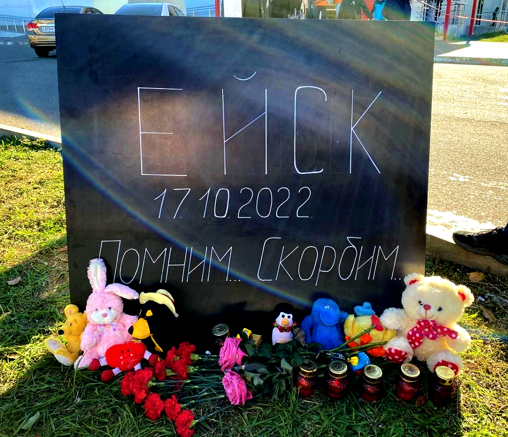 В Ейске появился стихийный мемориал, посвященный трагедии. Люди приносят свечки и игрушки.