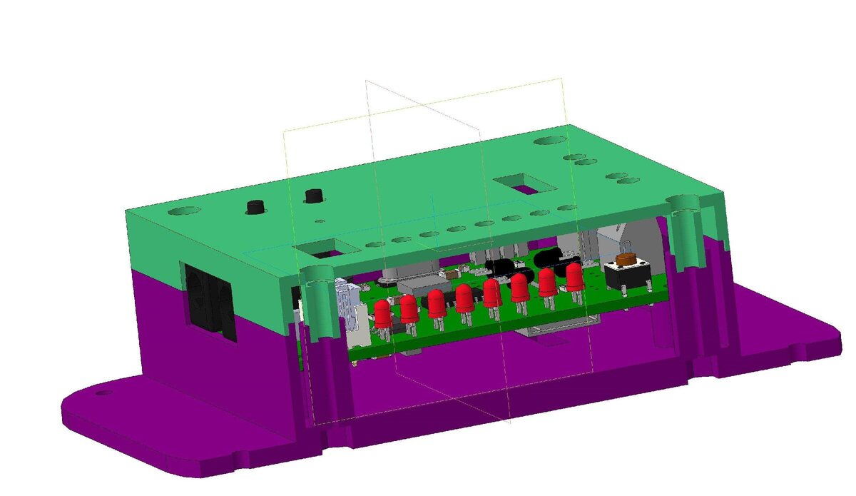 Речь пойдет про выравнивание светодиодов при монтаже. Прилагаю усилия к рождению девайса, что на рисунке ниже Модель немного не точна, в плане высоты установки LED. Лень было переделывать модели. Но суть в том, что они должны быть установлены так, что бы часть линзы входила в отверстия в крышке. Расстояние от нижнего торца линзы до платы должно быть 13 мм. При этом они должны быть установлены в ряд. Те, кто держал в руках паяльник должны знать, что установить компоненты так, что бы они были на одной высоте и стояли достаточно ровно, является несколько замороченной задачей.В общем, дошел я до стадии монтажа светодиодов. Сам монтаж я не заснял. Есть только фото ДО и ПОСЛЕ. Собственно, вот что получилось Светодиоды стоят достаточно ровно, а небольшие отклонения будут устранены дополнительным позиционированием отверстиями в крышке. В общем, как запаять LED с допустимым уровнем кривизны. Достаточно вставить между выводами светодиодов картонку/пластик. высотой, которая равняется высоте монта