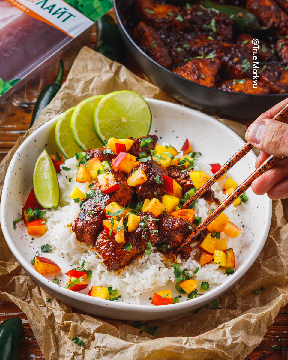Для 2-3 порций — 500 г стейков из грудки индейки, нарезанных кубиками по 2-3 см — 50 мл соевого соуса — 2 ст. л. коричневого сахара — 3 ст. л. томатной пасты — 1 репчатый лук, мелко нарубленный — 4 зубчика чеснока, измельченных — кусок натертого имбиря размером с большой палец — щепотка хлопьев перца чили — 2 ст. л. кунжутного масла — пучок кинзы Для сальсы — 2 сладких персика — ½ репчатого лука — 1 острый перец — пучок кинзы Для кокосового риса — 400 мл кокосового молока — 100 мл воды — 200 г риса басмати — щепотка соли 1. Смешайте соевый соус, томатную пасту, сахар, чеснок, лук, имбирь, острый перец. Замаринуйте на ночь в соусе индейку. 2. Для сальсы мелко нарежьте все ингредиенты, перемешайте, оставьте на 15 минут. 3. Поставьте сковороду на сильный огонь обжарьте индейку 10 минут, влейте оставшийся в миске соус, перемешайте и дайте ему карамелизоваться. Посыпьте листьями кинзы, переложите мясо в миску, накройте фольгой. 4. Для риса. Промойте рис под холодной водой. Влейте в кастрюл