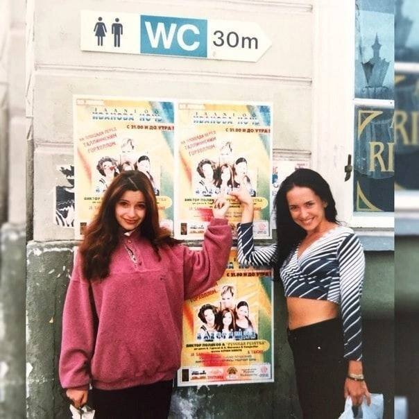 Ольга Орлова и Жанна Фриске на фоне афиш группы«Блестящие», 1997 год